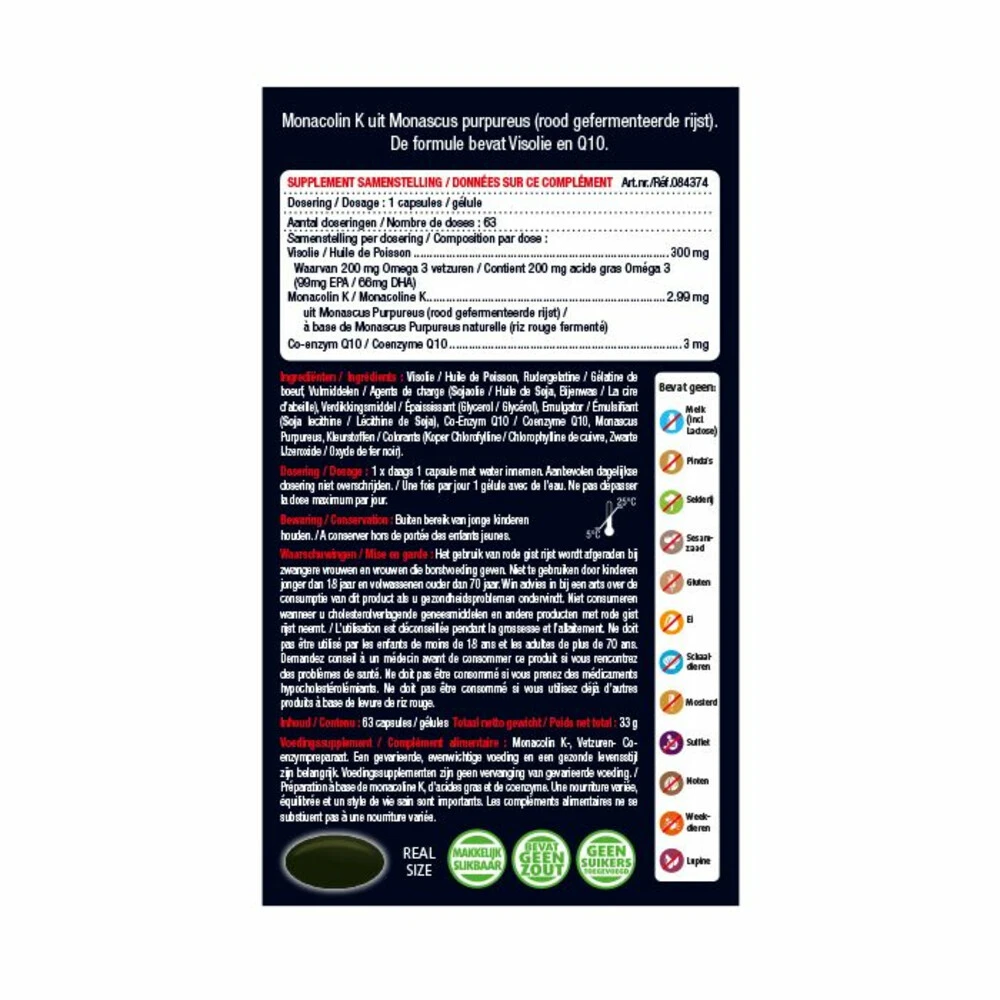 Lucovitaal Rode Gist Rijst met Q10 en VisolieLucovitaal Rode Gist Rijst met Q10 en Visolie bevat 2.99 mg Monacolin K uit Monascus purpureus (rood gefermenteerde rijst), visolie en Q10.2.99 mg Monacolin K uit Monascus purpureusRode Gist Rijst met Visolie & Q10Makkelijk slikbare capsules