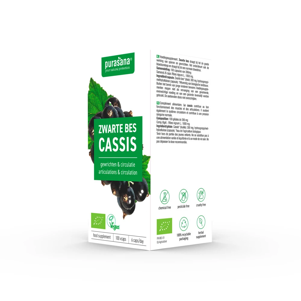 Purasana Zwarte Bes 300 mg Zwarte bes is een bekende plant die in grote delen van Europa en Azië voorkomt. Je kunt er jam van maken en het wordt gebruikt voor het maken van cassis. Purasana Zwarte bes wordt gemaakt van de bladeren van de zwarte bes, ook wel bekend als ribes nigrum.Voor het behoud van soepele gewrichten*Draagt bij tot de normale werking van spieren*Helpt op gewicht te blijven**Gezondheidsclaim in afwachting van goedkeuring door de Europese Commissie