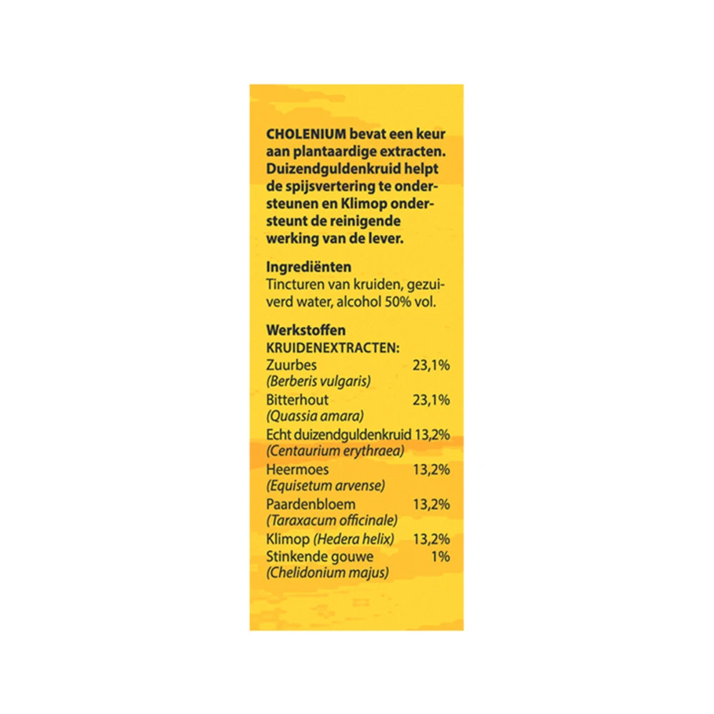 Bloem Cholenium nr 064 Lever** FormuleBloem Cholenium nr 064 is een kruidentinctuur met Klimop, Zuurbes, Bitterhout, Echte Duizendguldenkruid, Heermoes, Paardenbloem en Stinkende Gouwe.Duizendguldenkruid helpt de spijsvertering te ondersteunen en Klimop ondersteunt de reinigende werking van de lever.Klimop ondersteunt de reinigende werking van de lever*Â Duizendguldenkruid helpt de spijsvertering te ondersteunen*** Klimop**Duizendguldenkruid