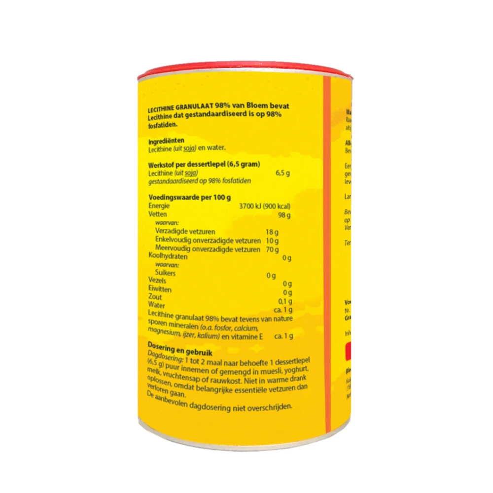 98% GranulaatBloem Lecithine Granulaat 98% bevat van nature sporen mineralen zoals fosfor, calcium, magnesium, ijzer kalium en de vitamine E. Bloem Lecithine Granulaat kun je puur innemen maar ook vermengen met yoghurt, muesli, melk, vruchtensap of rauwkost.