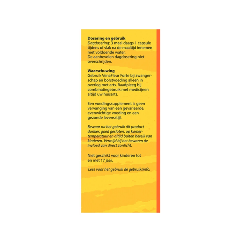 VenaFleur Benen Formule(1)Bloem VenaFleur is een voedingssupplement dat naast een gestandaardiseerd druivenpit extract, tevens vitamines, mineralen en kruiden bevat. Eén van de kruiden is Paardenkastanje*, dat helpt bij zware benen en is goed voor de bloedcirculatie. Vitamine C* is gunstig is voor soepele aderen en voor een goede conditie van de bloedvaten.Voor de bloedcirculatie (Paardenkastanje)*Bij zware benen (Paardenkastanje)*Voor een goede conditie van de bloedvaten (Vitamine