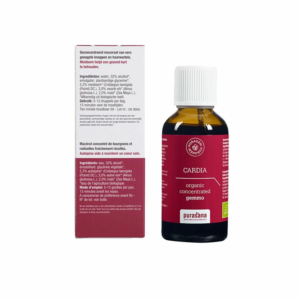 Purasana Puragem Cardia BioPurasana Puragem Cardia Bio bevat de maceraten uit meidoorn, els en mais. Mais ondersteunt de hartfunctie. Els ondersteunt de bloedsomloop. Meidoorn helpt spanningen verminderen.Ondersteunt het hartOndersteunt de bloedsomloopMet meidoorn, zwarte els en maisDe gezondheidsclaims die wij over dit product doen zijn als wetenschappelijk bewezen beoordeeld door de Europese Unie (EFSA, European Food Safety Authorities).