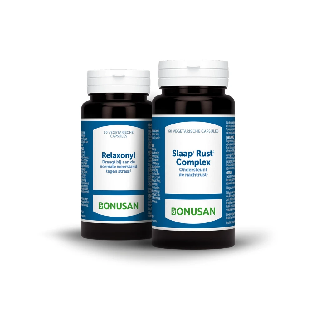 Bonusan Slaap & Ontspanning PakketBonusan Slaap & Ontspanning Pakket bevat Relaxonyl voor overdag en Slaap- Rust Complex voor ‘s nachts. Relaxonyl draagt bij tot de normale weerstand tegen stress* en helpt ontspanning te ondersteunen* dankzij ashwagandha. Slaap Rust Complex ondersteunt de nachtrust* dankzij valeriaan1. Met dit pakket kun je dus 24 uur per dag rekenen op de juiste ondersteuning voor slaap, rust én ontspanning.Gebaseerd op wetenschap en jarenlange ervaring van